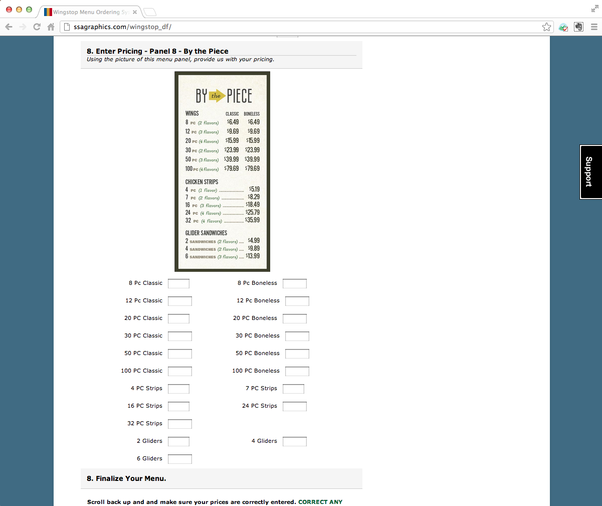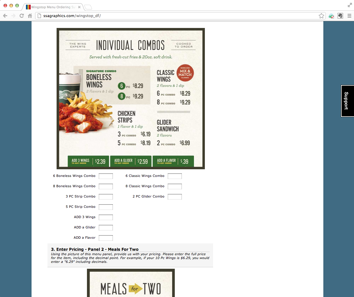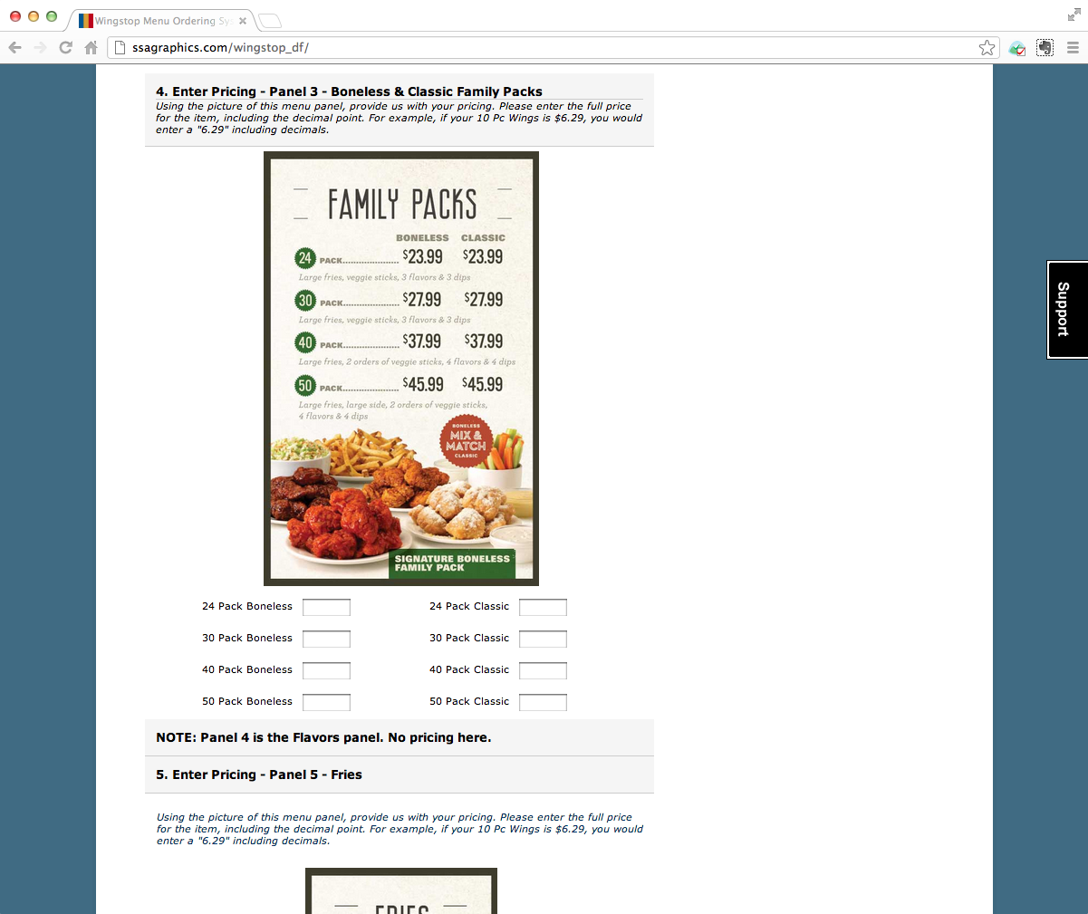 I created a form on our website, complete with graphics instructions, menu panel art and field for all of their prices. Franchisees or managers were asked to log in, answer some store specification characteristics (used in cross-over Unit Specification Project), their menu dimensions and then all of their current pricing for each menu item.